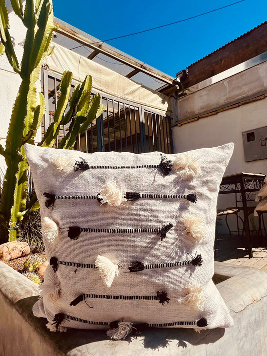 Capa de Almofada Algodão Bordada Com Pompom Preto e Cru 50x50cm