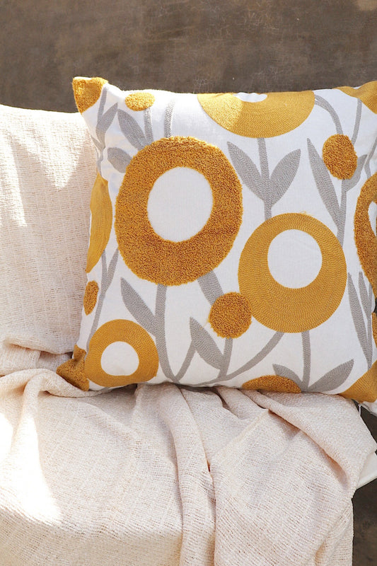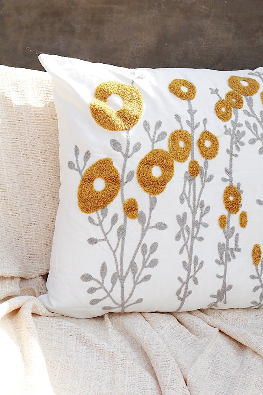 Capa de Almofada Bordada em Linho 45x45 Flores Mostarda e Cinza