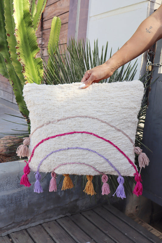 Capa de Almofada Algodão Baguete Bordada Pompom Arco Íris Rosa 30x50cm