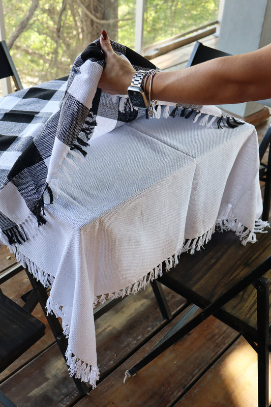 • Toalha de Mesa Cobre Lanche com Duas Peças: Lisa Branca e Xadrez Preto e Branco