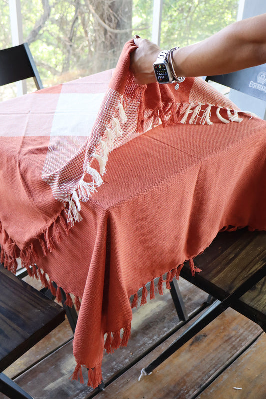 • Toalha de Mesa Cobre Lanche com Duas Peças: Lisa e Xadrez Terracota
