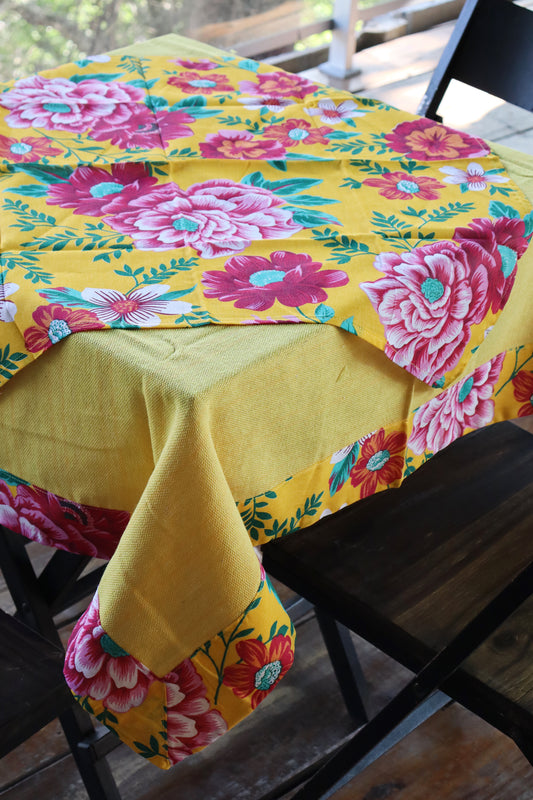 • Toalha de Mesa com Barra de Chita Amarela com Composê 1,10x1,10m