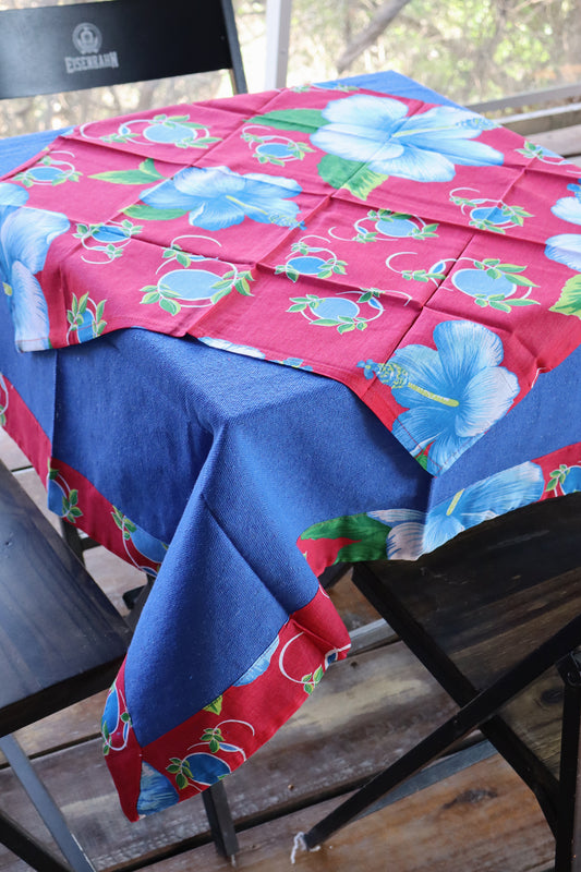 • Toalha de Mesa com Barra de Chita Azul/ Vermelho com Composê 1,10x1,10m