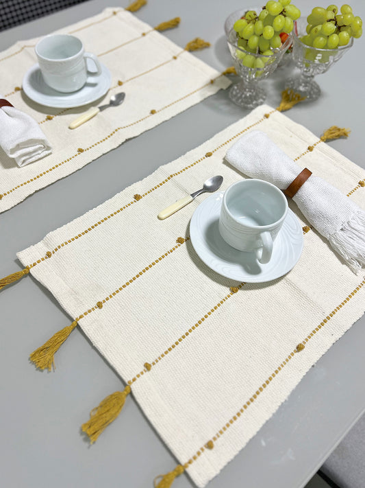 Manta para Sofá / Peseira Lisa Cru com Pompom Mostarda Boho 1,20mx1,80m