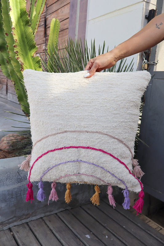 Capa de Almofada Algodão Bordada Pompom Arco Íris Rosa 50x50cm
