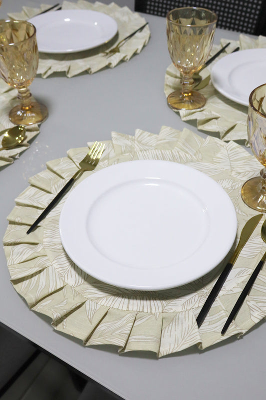 Lugar Americano Redondo Impermeável Babados Folhas Bege Claro