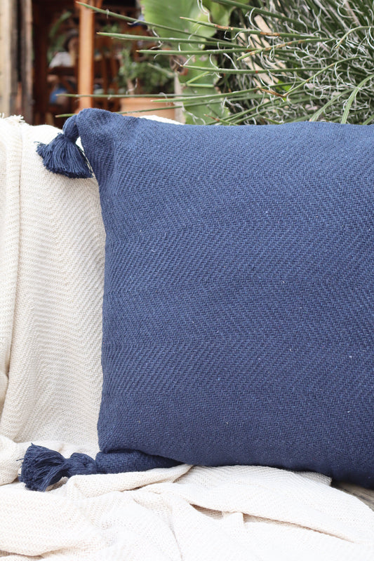 Capa de Almofada Boho Escama com Pompom Lisa Azul Marinho 45x45