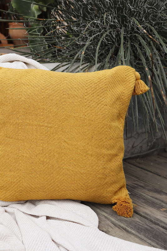 Capa de Almofada Boho Escama com Pompom Lisa Mostarda 45x45