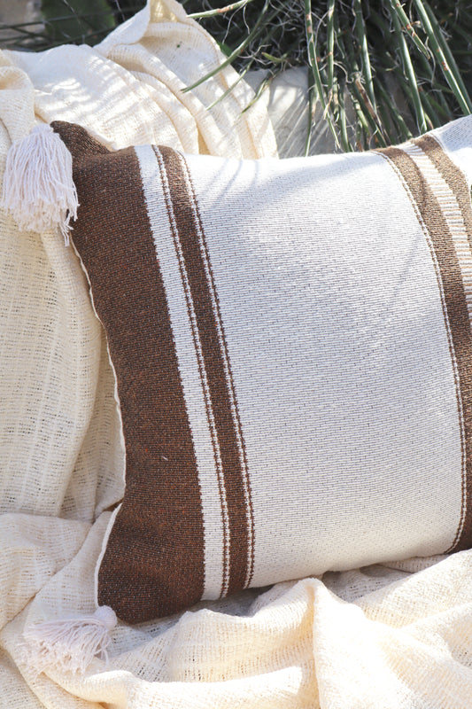 Capa de Almofada Boho Estampada com Pompom Listras Marrom 45x45