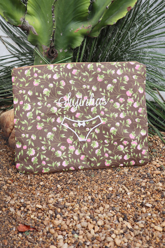 Necessaire Porta Calcinha Limpinha Sujinha G Flores Fundo Marrom