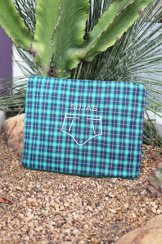 Necessaire Porta Cueca Limpinha Sujinha G Xadrez Azul e Verde