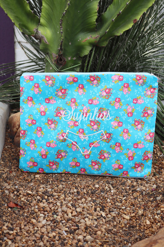 Necessaire Porta Calcinha Limpinha Sujinha G Flores Fundo Azul