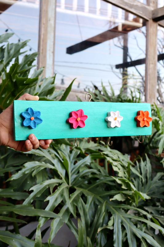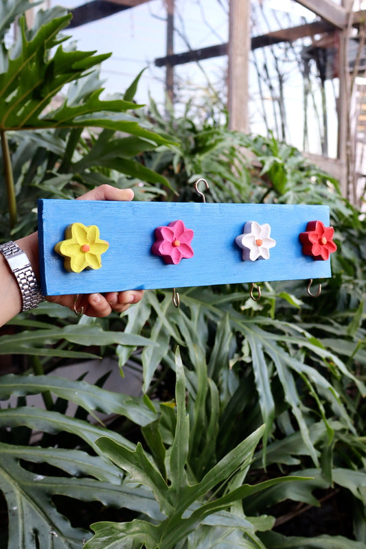 Cabide de Madeira Azul com 4 Ganchos Flor Colorida