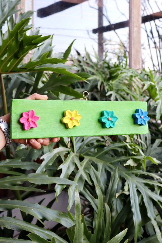 Cabide de Madeira Verde com 4 Ganchos Flor Colorida