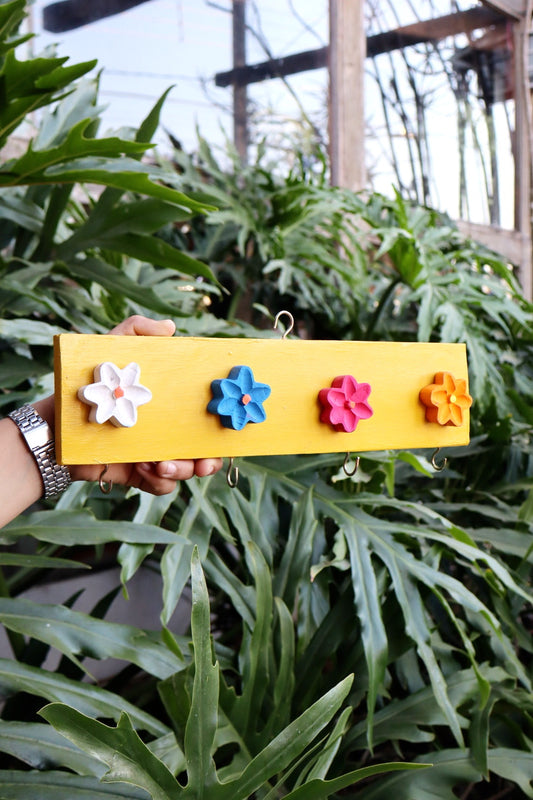Cabide de Madeira Amarelo com 4 Ganchos Flor Colorida
