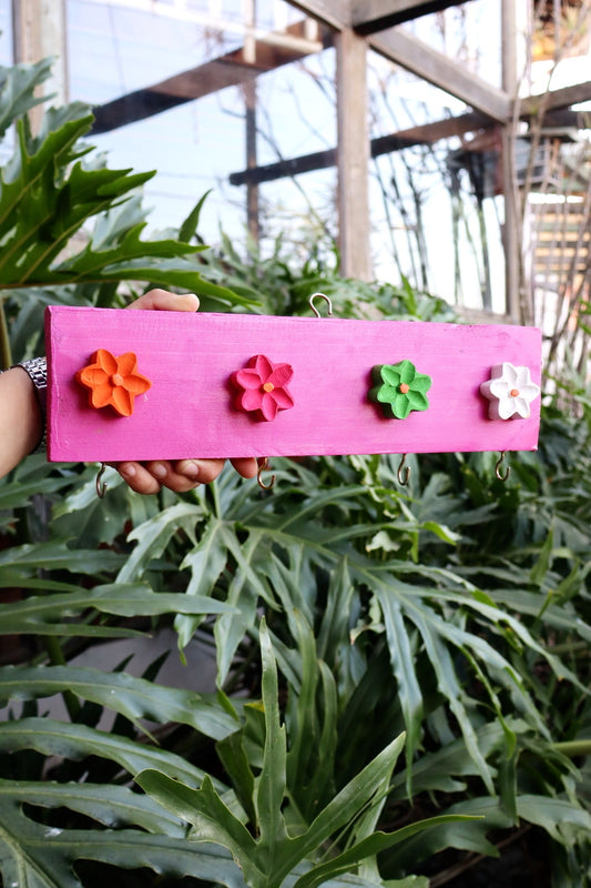 Cabide de Madeira Rosa com 4 Ganchos Flor Colorida
