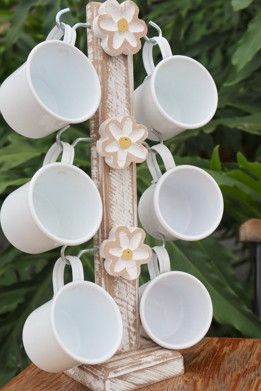 Suporte de Caneca Branco Madeira + 6 Canecas Brancas