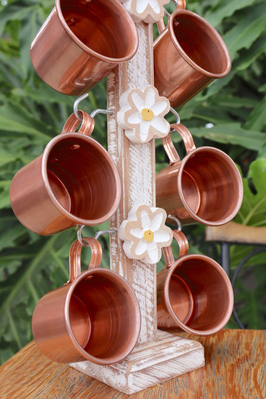 Suporte de Caneca Branco Madeira + 6 Canecas Cobre