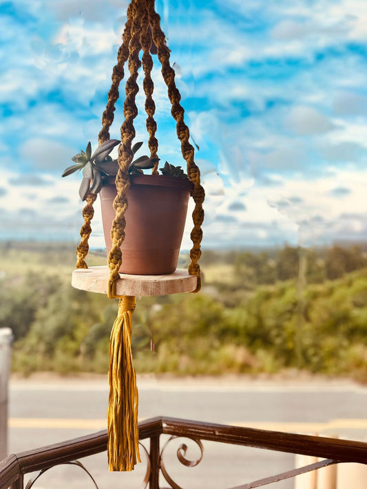 Suporte de Planta em Macramê Malha Um Vaso Com Base de Madeira Mostarda