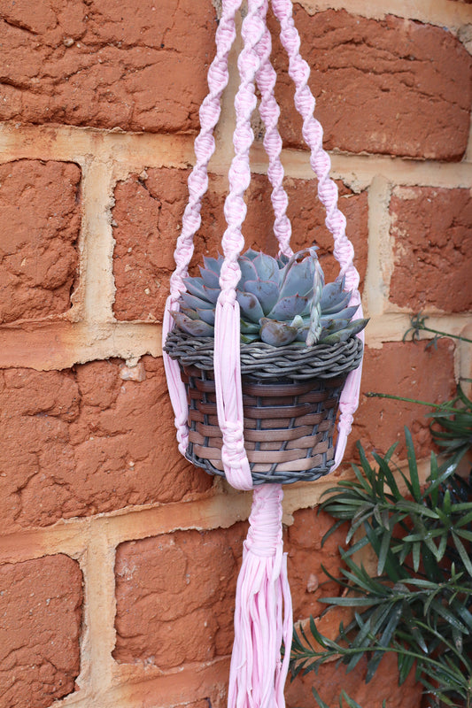 Suporte de Planta em Macramê Malha Um Vaso Rosa