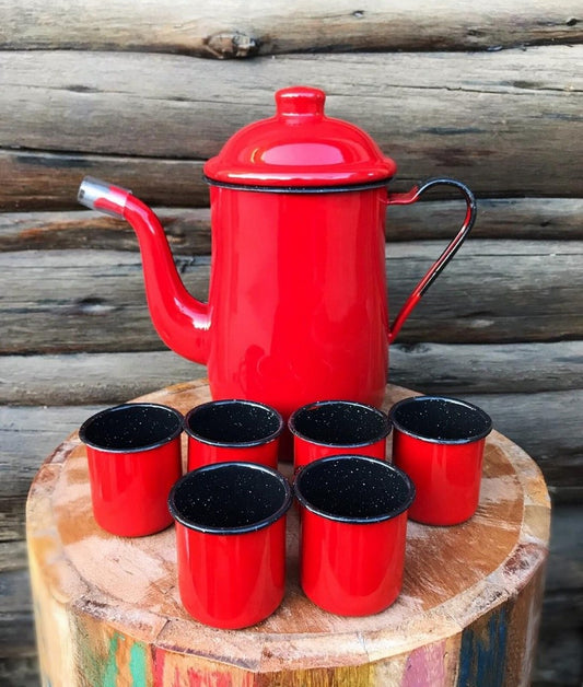 Kit Completo Bule + 6 Canecas Esmaltado Agatá MetalLouça Vermelho