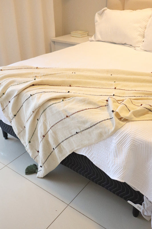 Manta para Sofá / Peseira Pompom Boho Colorida Neutra 1,20mx1,80m