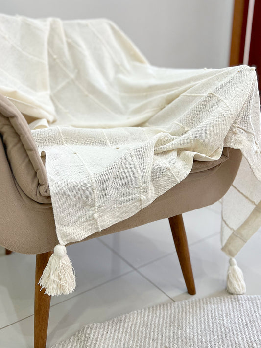 Manta para Sofá / Peseira Pompom Boho Cru 1,20mx1,80m