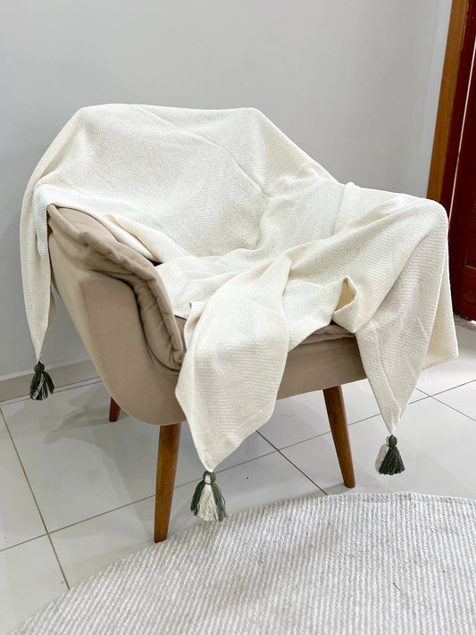 Manta para Sofá / Peseira Lisa Cru com Pompom Verde Boho 1,20mx1,80m