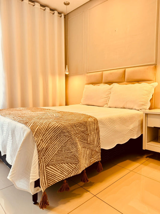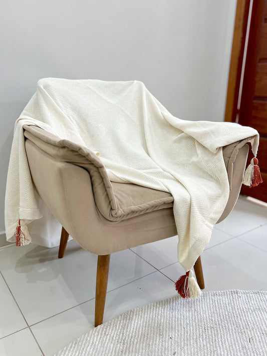 Manta para Sofá / Peseira Lisa Cru com Pompom Terracota Boho 1,20mx1,80m