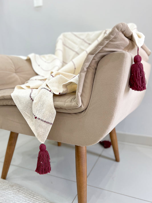 Manta para Sofá / Peseira Pompom Boho Vinho 1,20mx1,80m