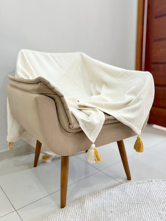 Manta para Sofá / Peseira Lisa Cru com Pompom Mostarda Boho 1,20mx1,80m