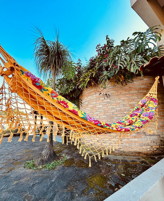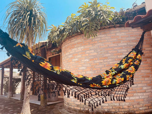 Rede de Algodão Forrada com Chita - Preto com Amarelo