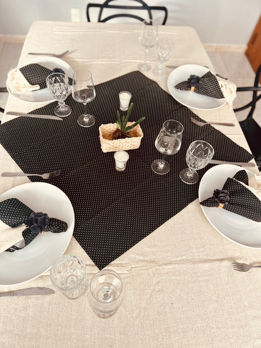 Toalha de Mesa com Barra de Tricoline Poá Preto com Composê 1,5mx2,2m