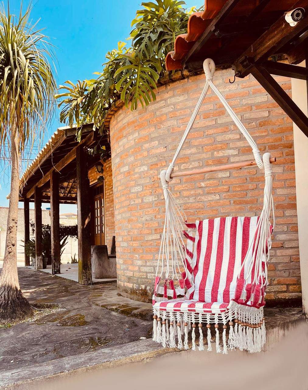 - Pode ser instalada também em uma haste de madeira resistente que suporte no mínimo 150 kg, que é o caso das casas ou varandas com telhado, utilizando cordas ou até mesmo correntes.