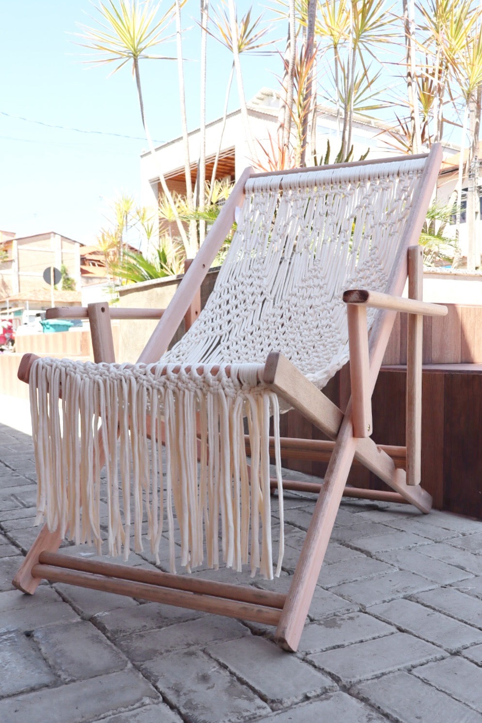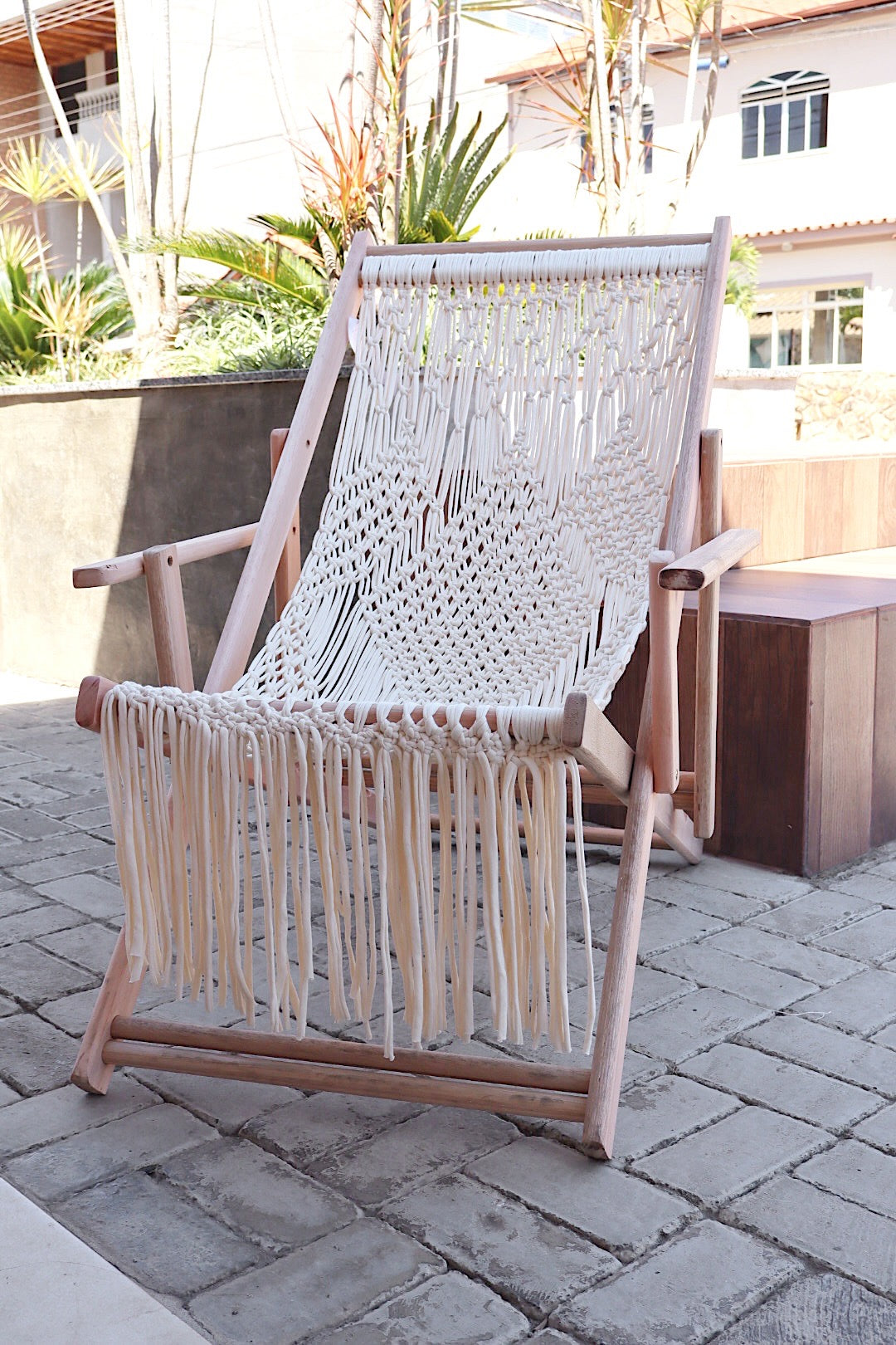 Nossa espreguiçadeira é feita em estrutura de madeira resistente e acabamento natural, trazendo aconchego e leveza para qualquer ambiente. O assento em macramê, todo confeccionado à mão, garante não só beleza e exclusividade, mas também conforto e firmeza ao sentar.