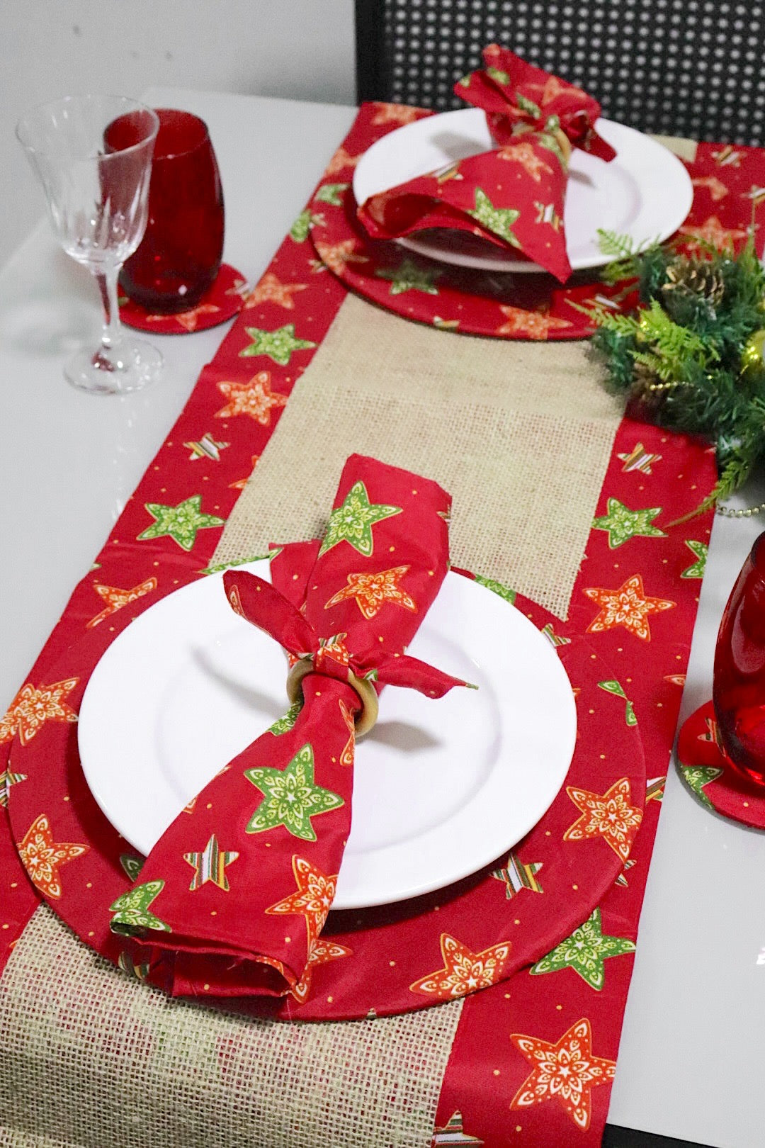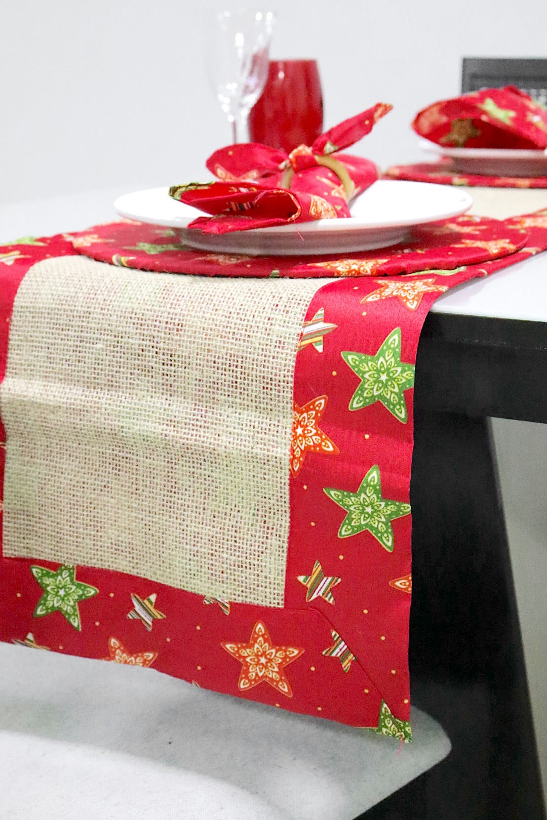 Caminho de Mesa Dupla Face Juta / Tecido Estrelas Vermelha Natal