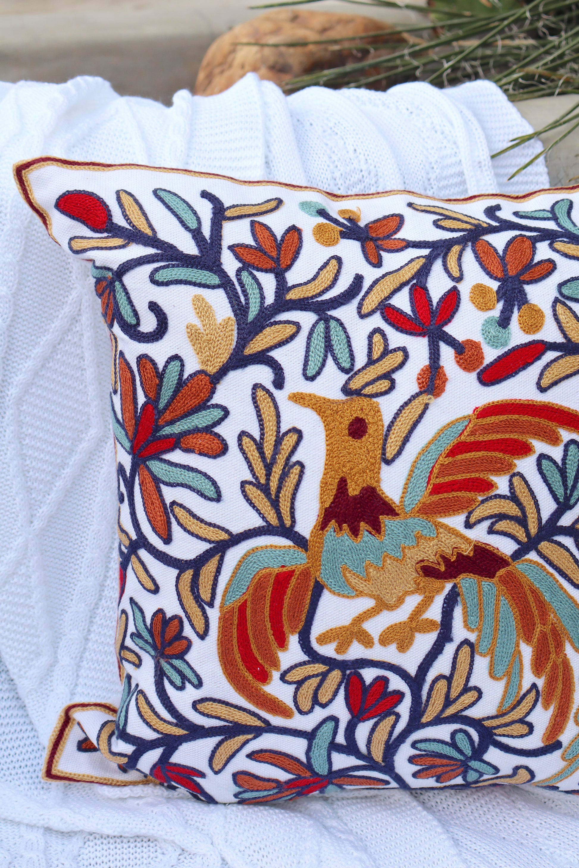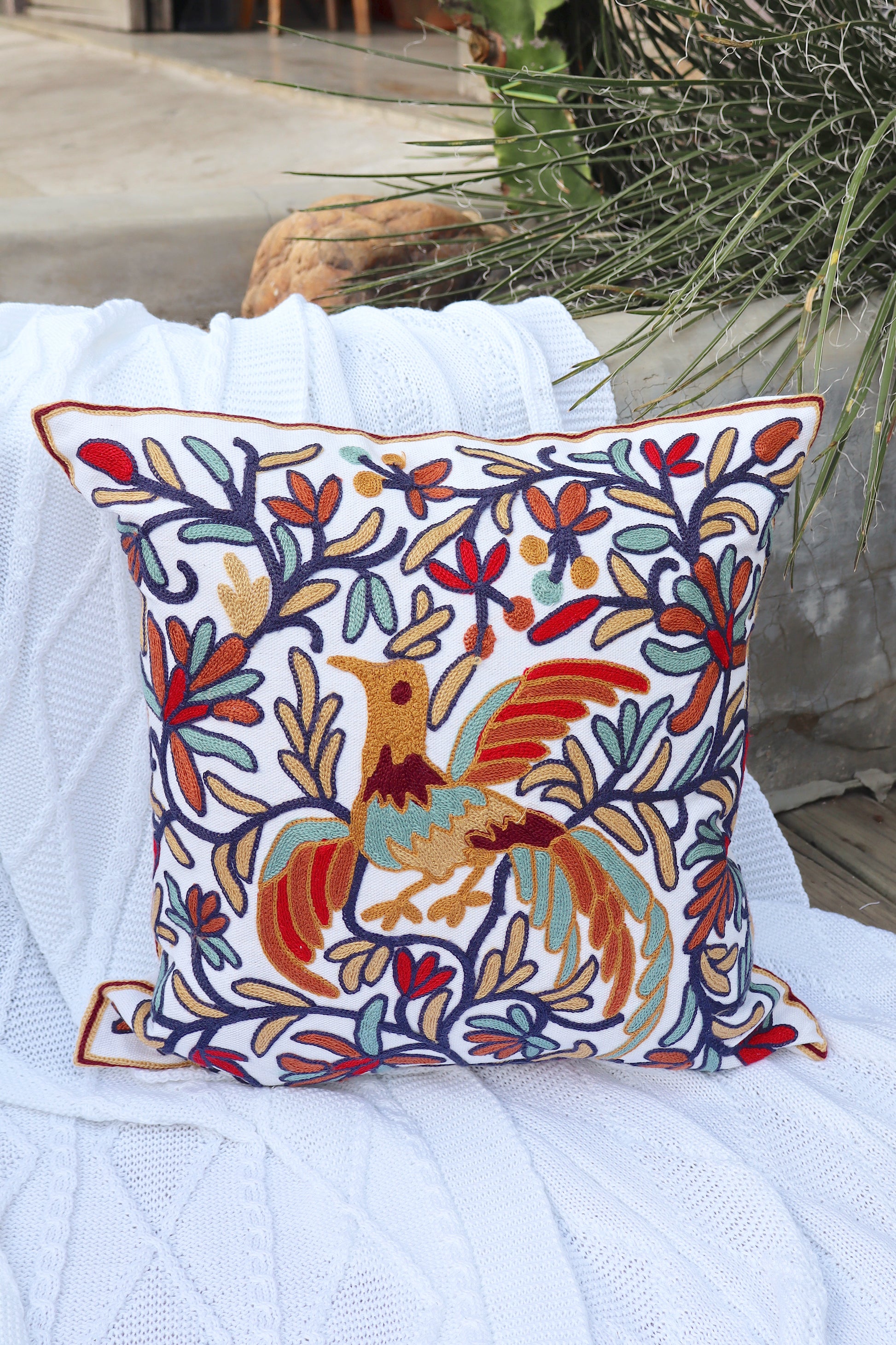 Capa de Almofada Bordada em Linho 45x45 Pássaro Colorido