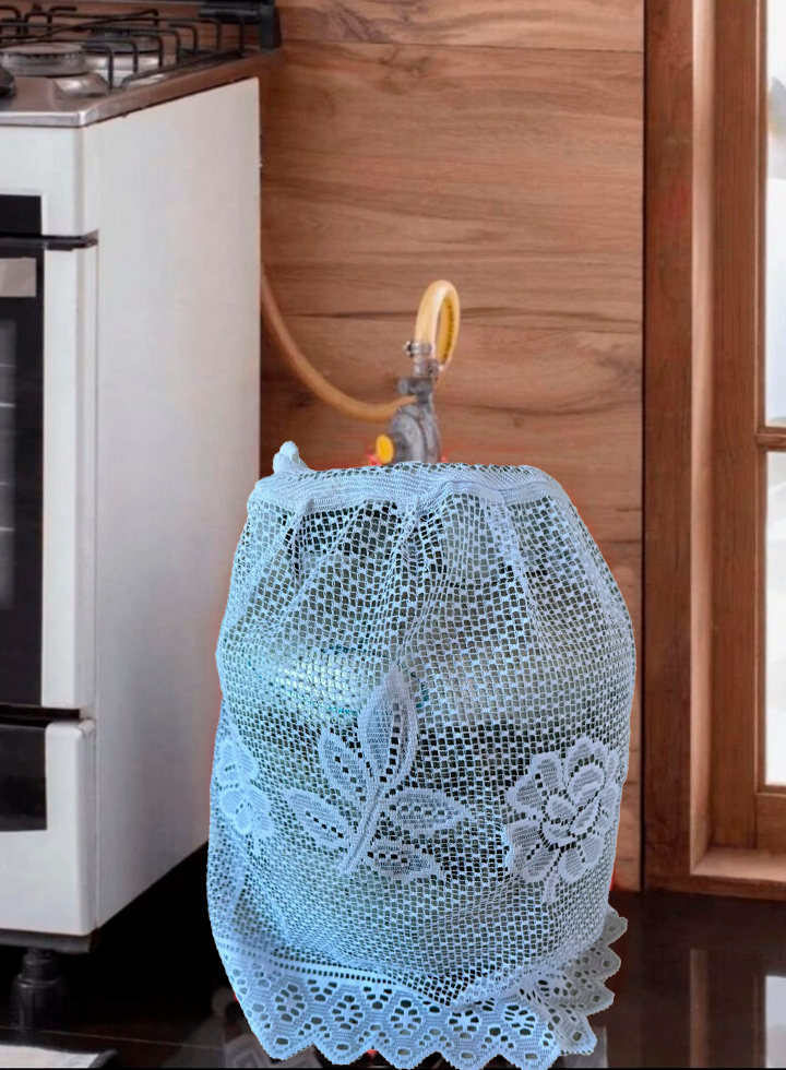 Descrição: A capa de botijão de gás é feita para decorar, proteger e muitas vezes para esconder o botijão na cozinha. Feita em tecido renda. Tamanho padrão. Abertura superior para válvula e mangueira de gás.