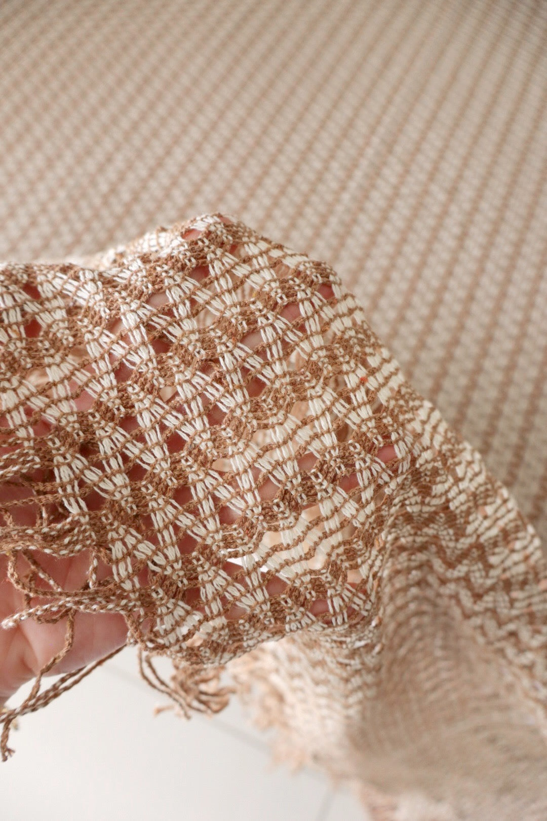 Colcha rendada em algodão. Seu traçado é vazado de ambos os lados e a franja é sem costura. Peça de excelente caimento e beleza.