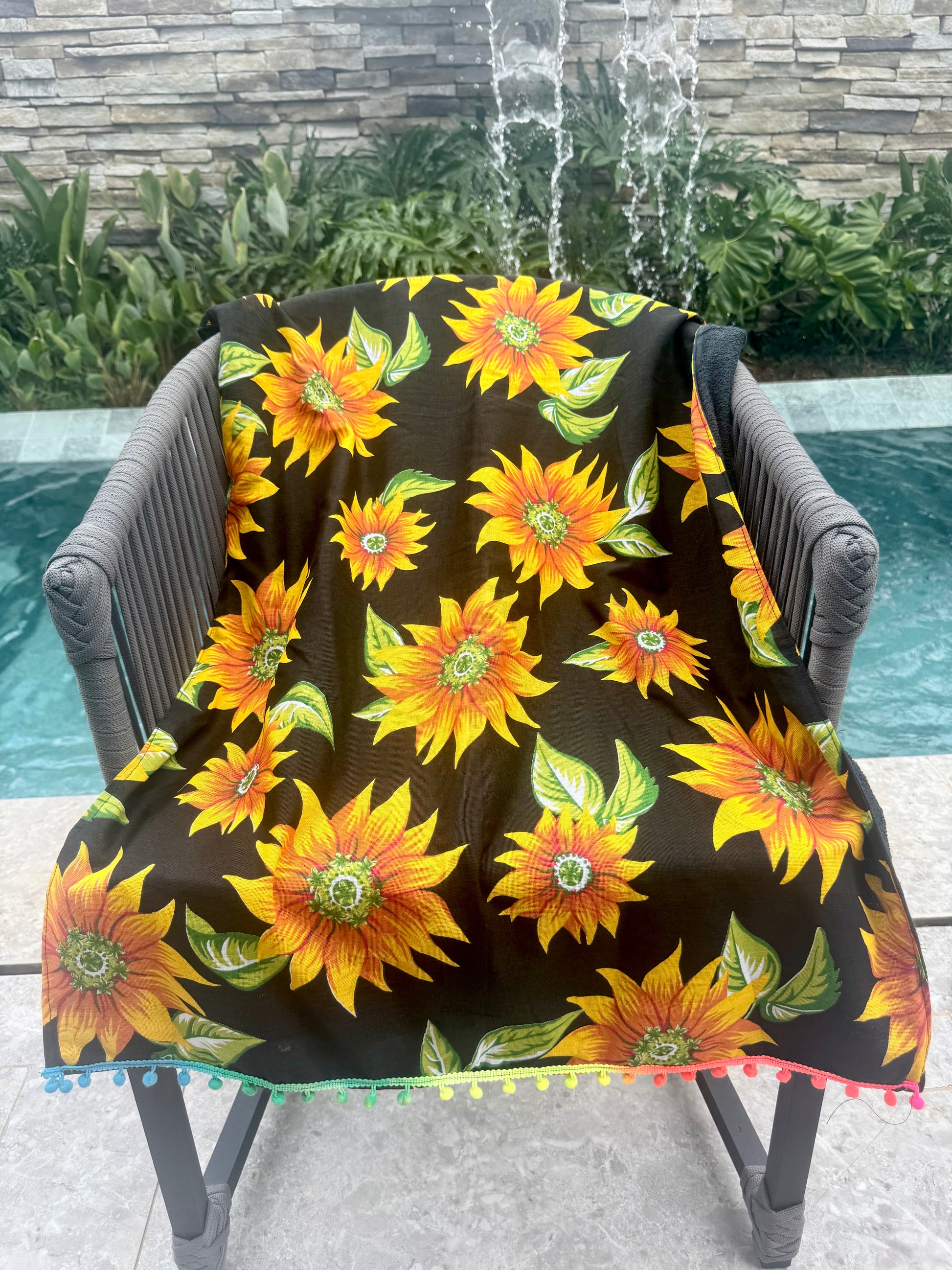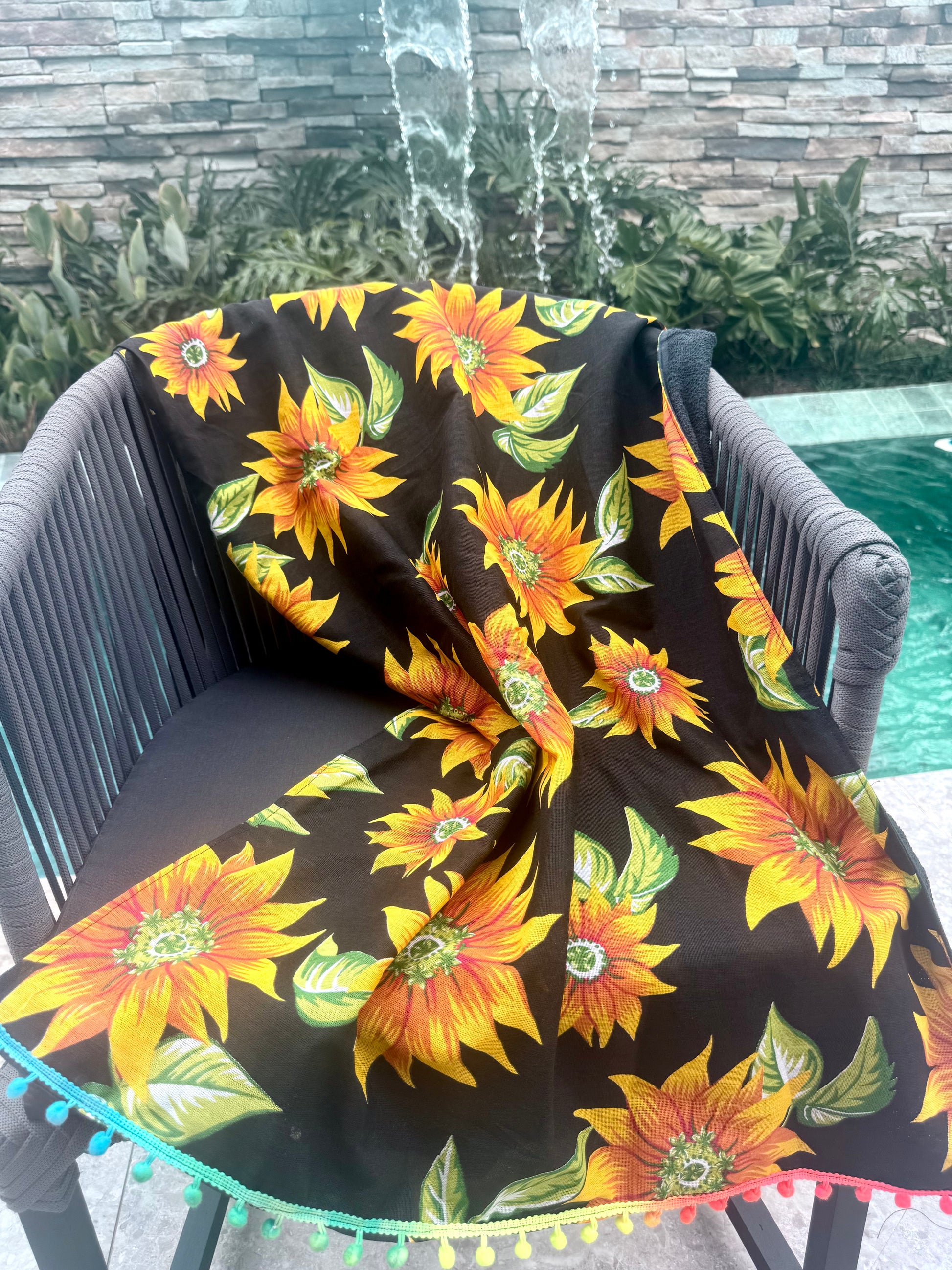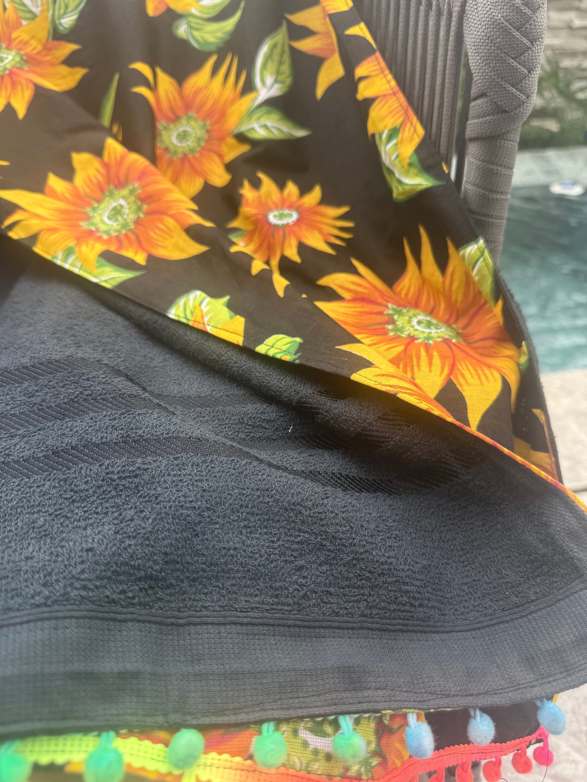 A canga feminina é confeccionada em chita com estampas florais, acrescentando toque macio e confortável. Possui textura atoalhada e barra de pompom colorido.