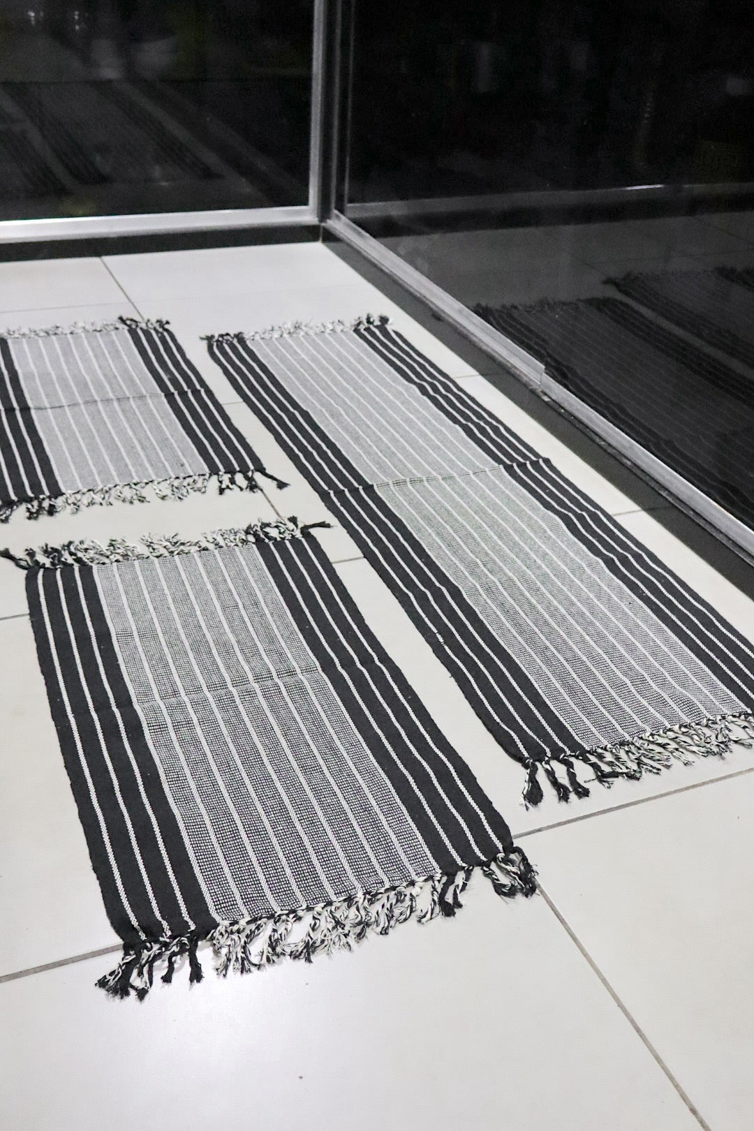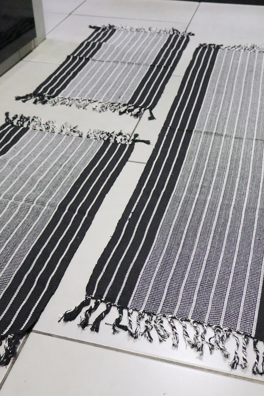 Esse Jogo de Passadeira em Algodão é tecido artesanalmente para uma adição durável e bonita na sua cozinha ou corredor. Ele contém 3 peças de qualidade, incluindo 2 tapetes. Cada item é feito com precisão e cuidado para oferecer uma ótima experiência e qualidade ao longo dos anos. O jogo é feito em um tecido mais fino.