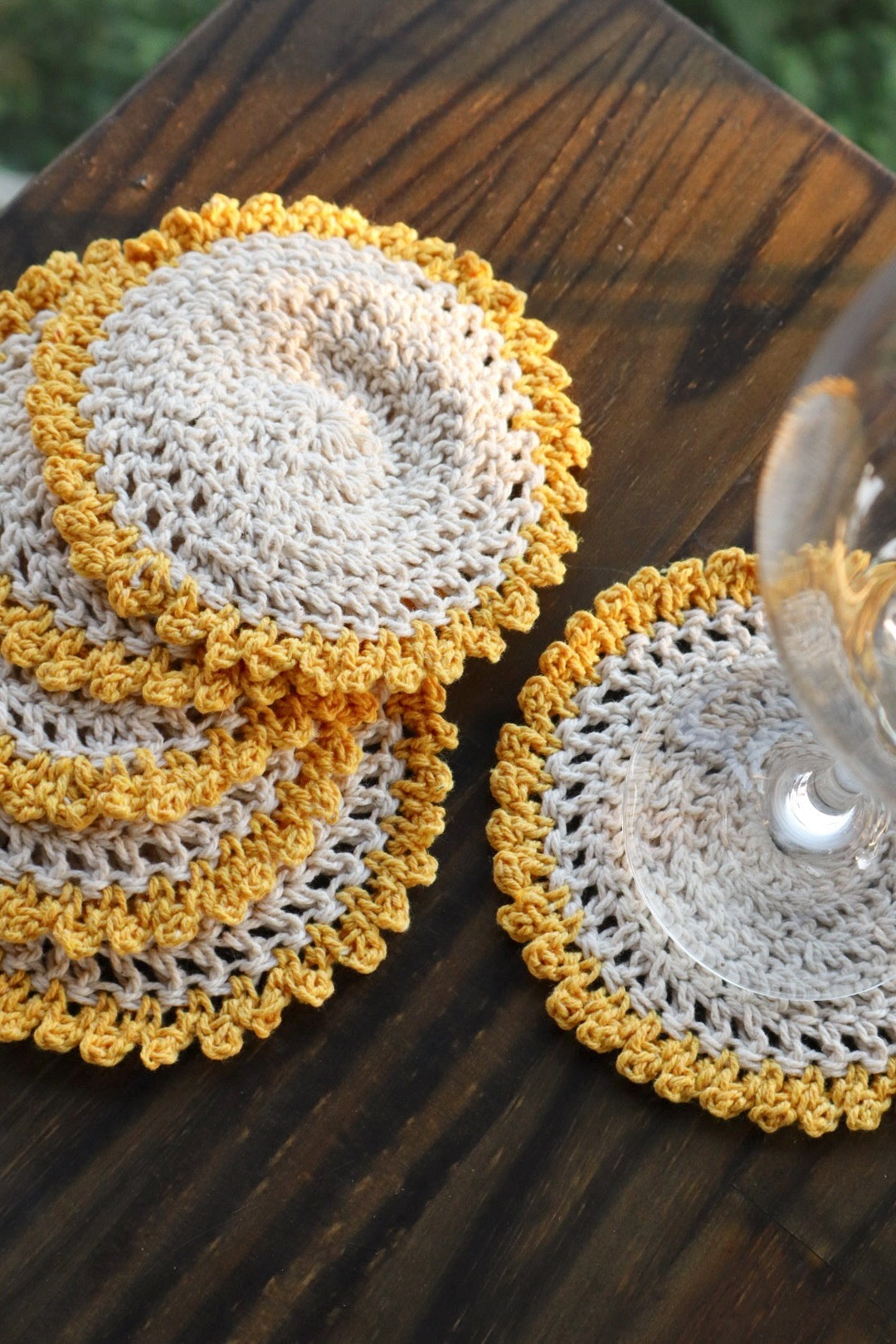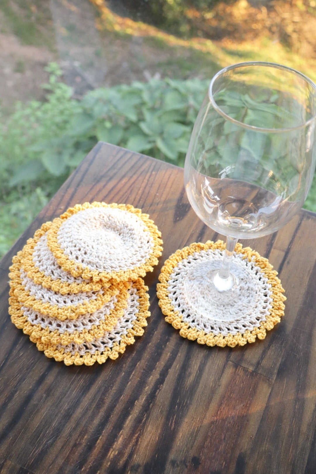 Kit 6 Porta Copos / Descanso Para Copos Crochê Cru com Beirada Amarela