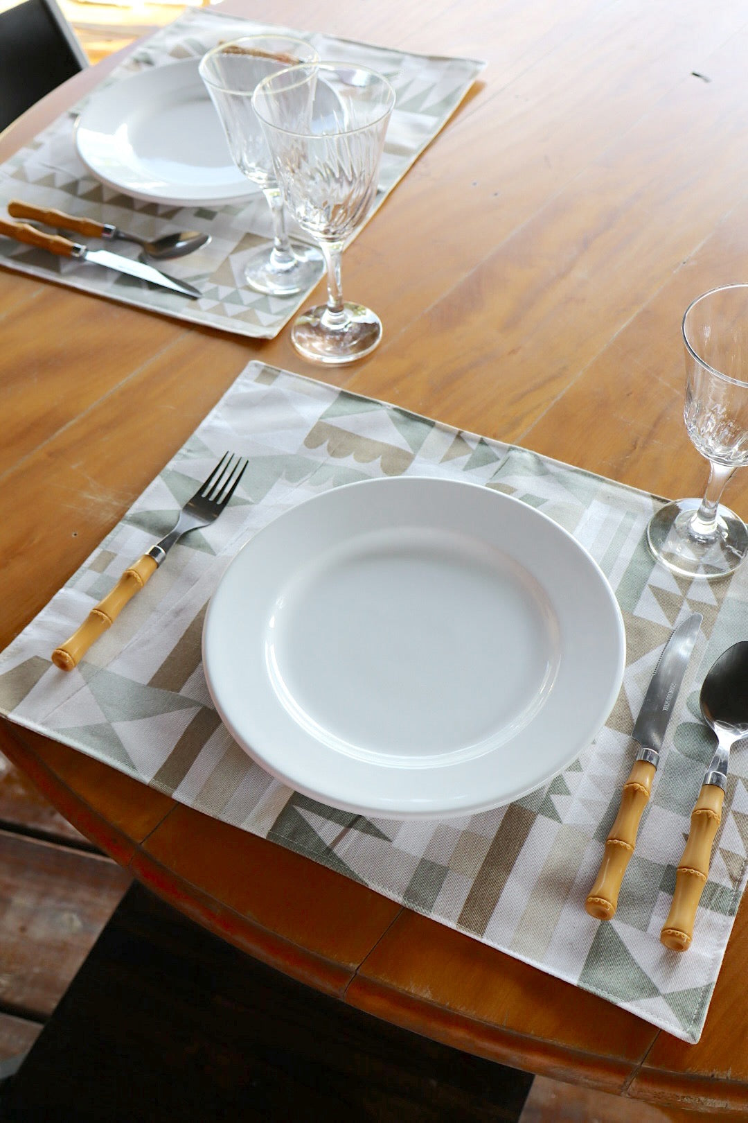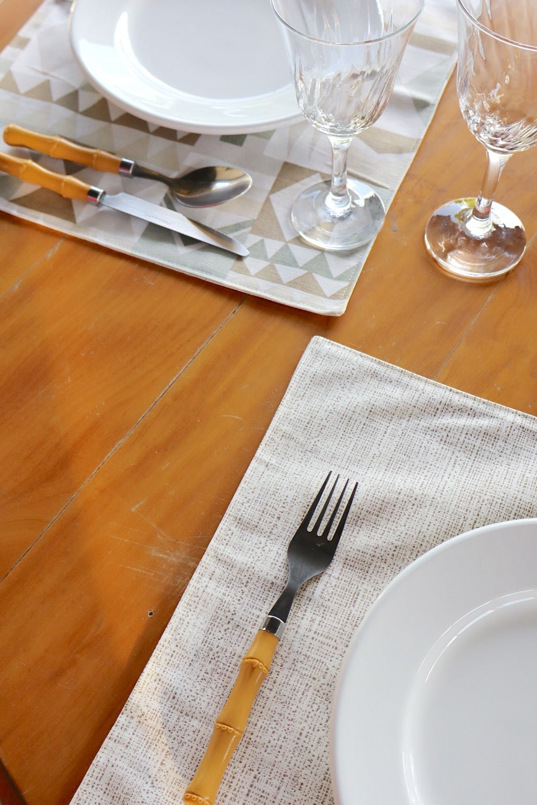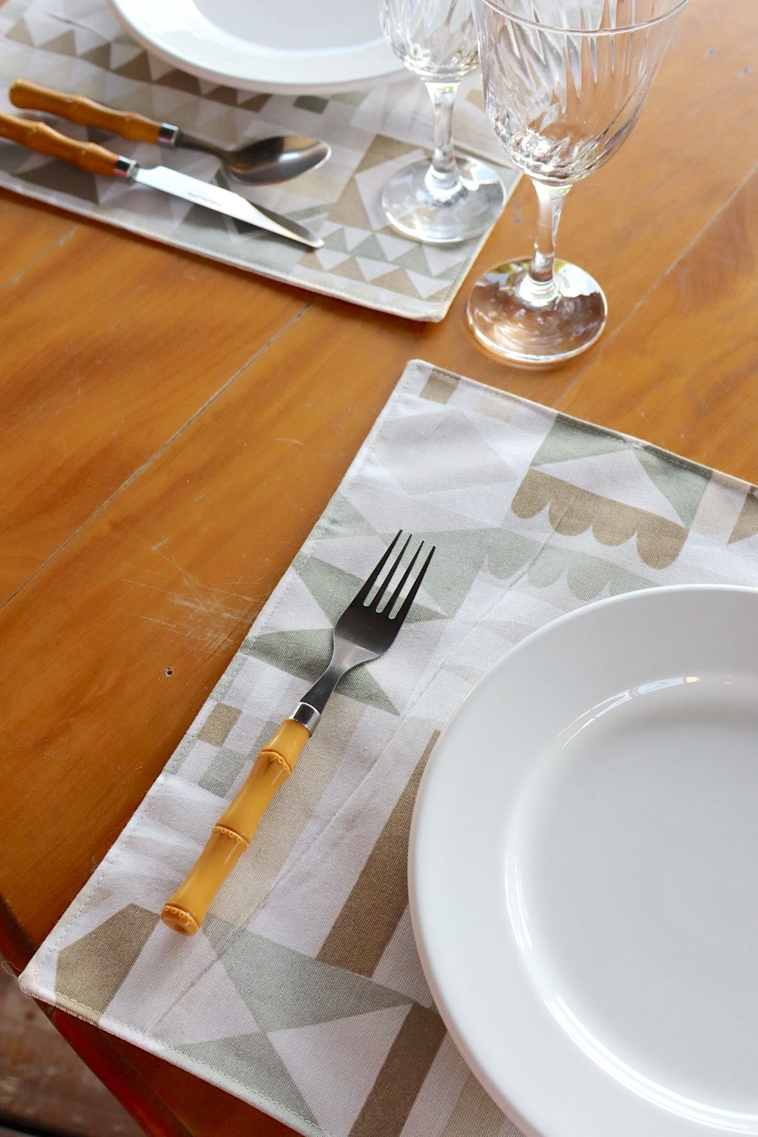 Lugar Americano Dupla Face Impermeável Mesclado Cru/ Geométrico Verde e Marrom