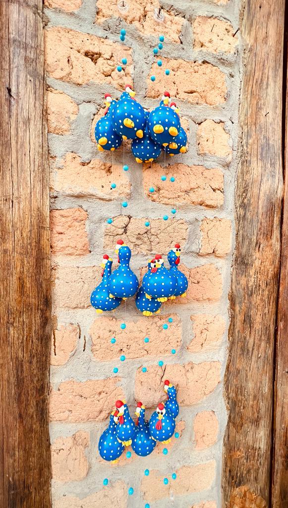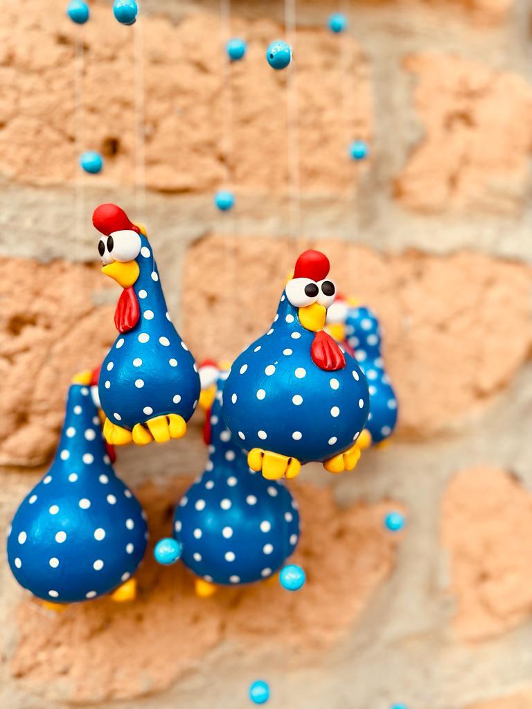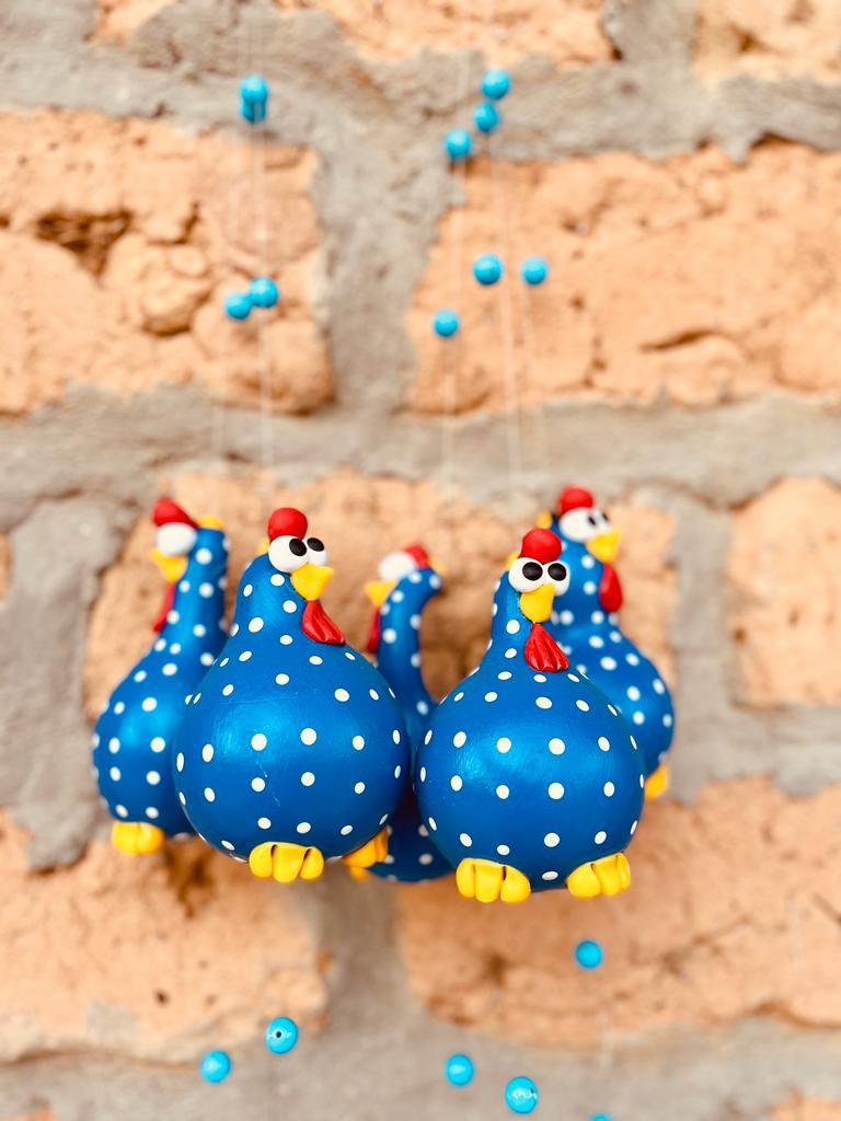 Móbile produzido com fio de nylon e 3 galinha em cabaça, pintados à mão e detalhes em biscuit.