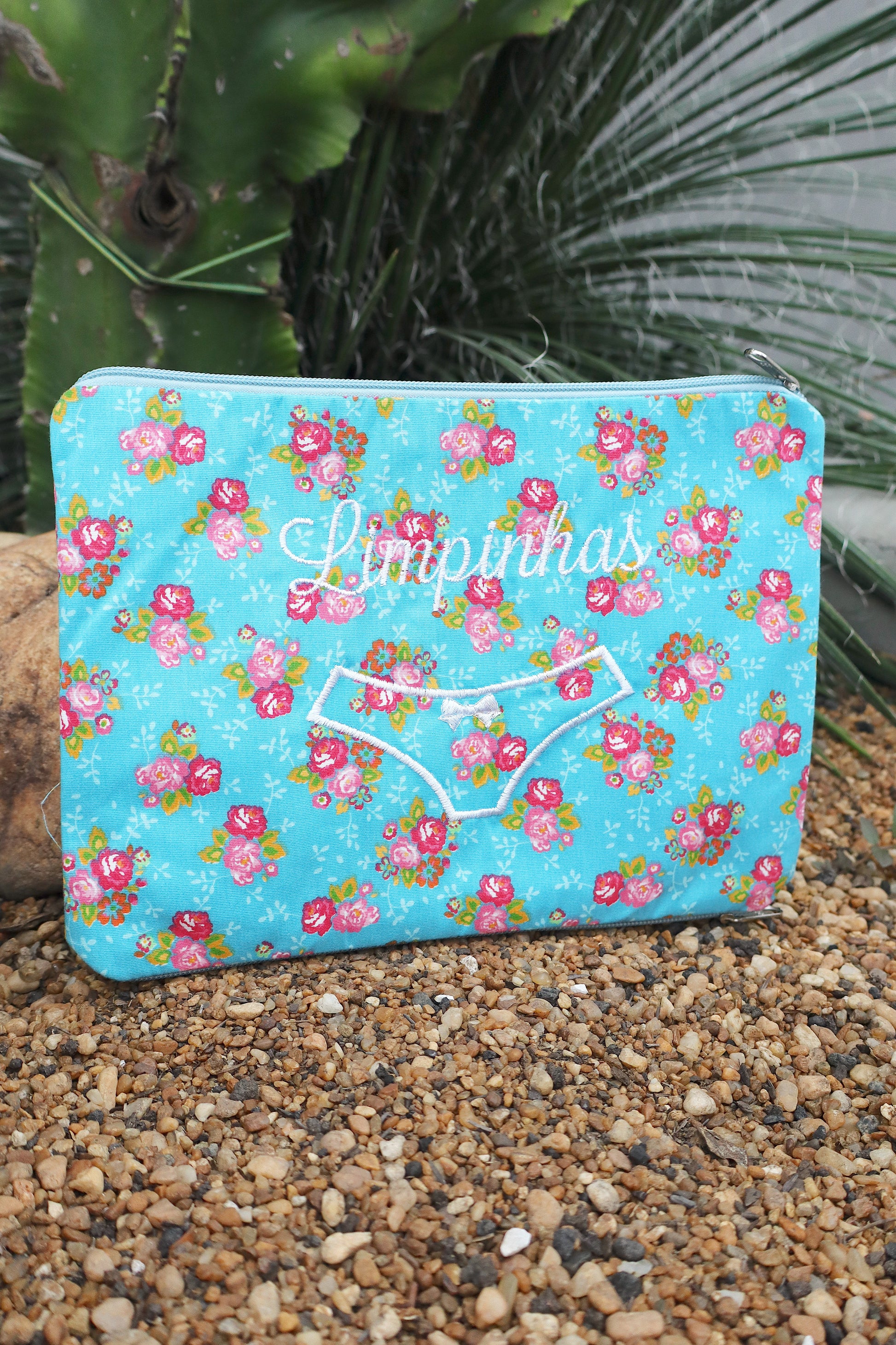 Necessaire Porta Calcinha Limpinha Sujinha P Flores Azul Claro