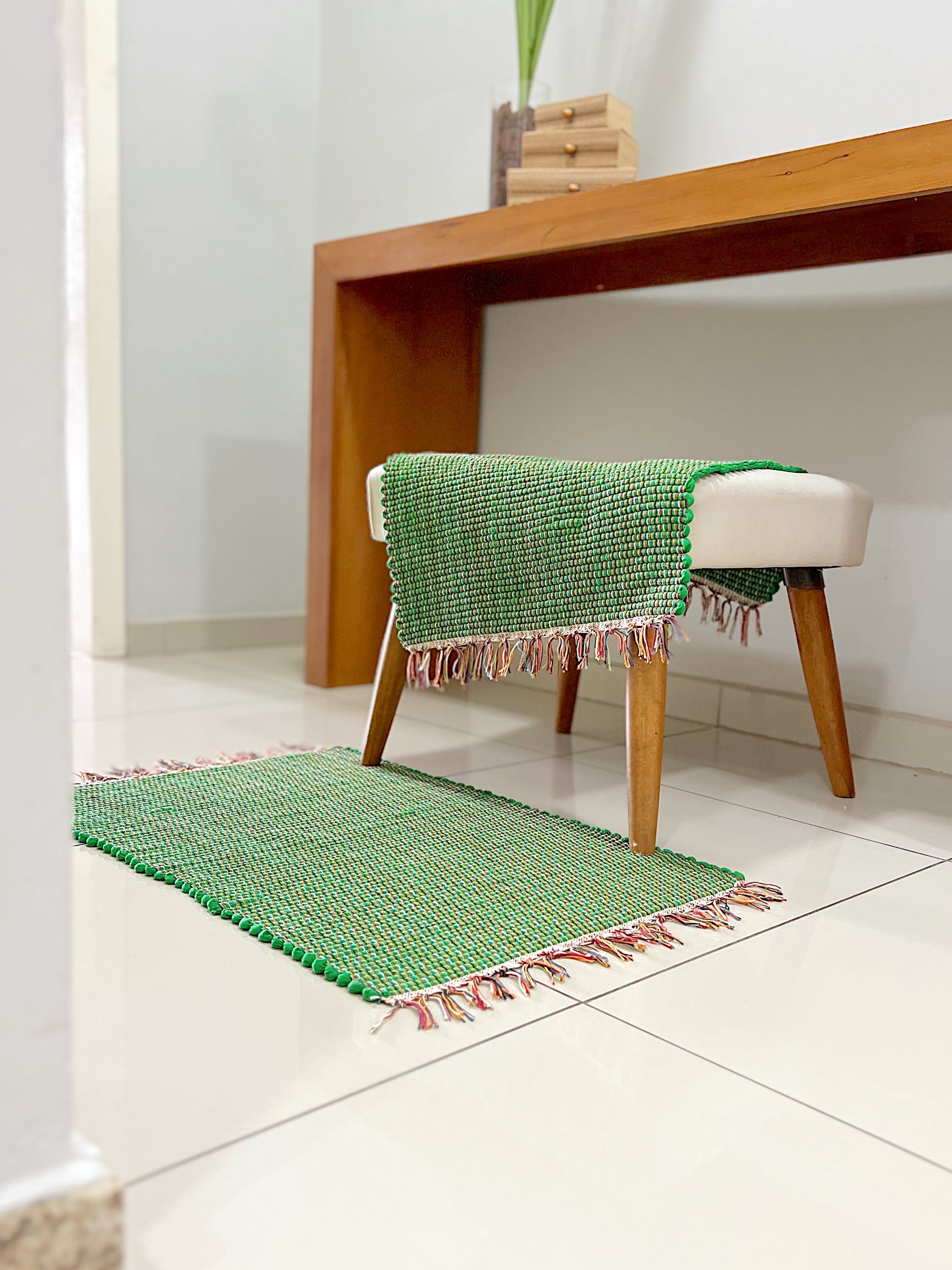 Acabamento com franjas, ótima durabilidade e facilidade na hora de lavar