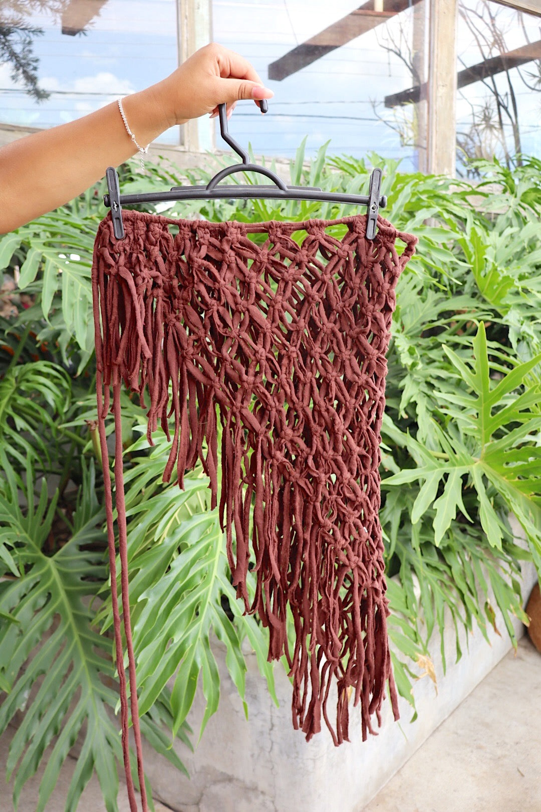 Saia toda em macramê, feita artesanalmente. Possui franjas, dando um movimento incrível. Peça artesanal e cheia de estilo, perfeita para compor com um biquíni, body ou até mesmo um shortinho por baixo e usar casualmente.