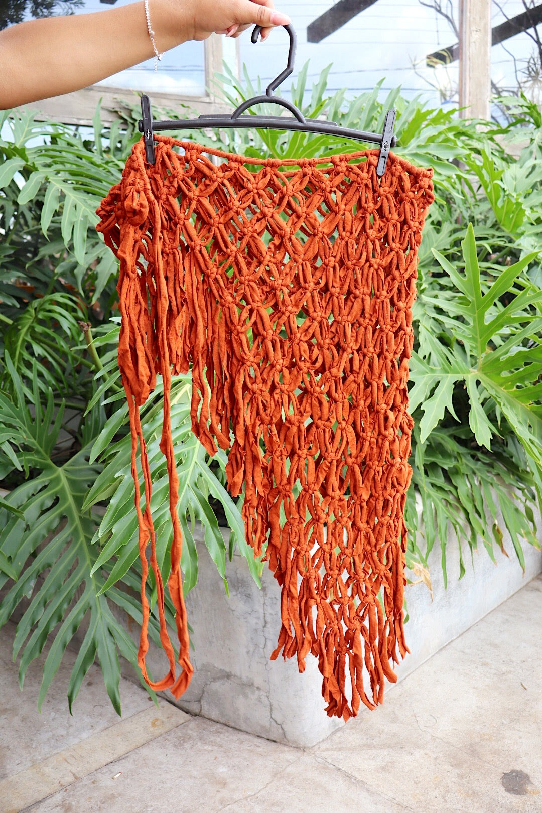 Saia toda em macramê, feita artesanalmente. Possui franjas, dando um movimento incrível. Peça artesanal e cheia de estilo, perfeita para compor com um biquíni, body ou até mesmo um shortinho por baixo e usar casualmente.