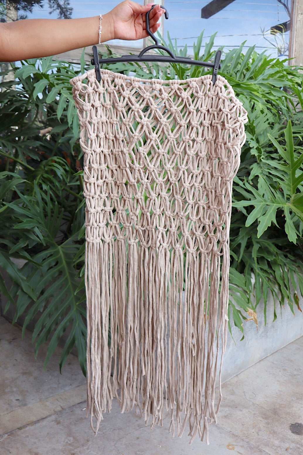Saia toda em macramê, feita artesanalmente. Possui franjas, dando um movimento incrível. Peça artesanal e cheia de estilo, perfeita para compor com um biquíni, body ou até mesmo um shortinho por baixo e usar casualmente.