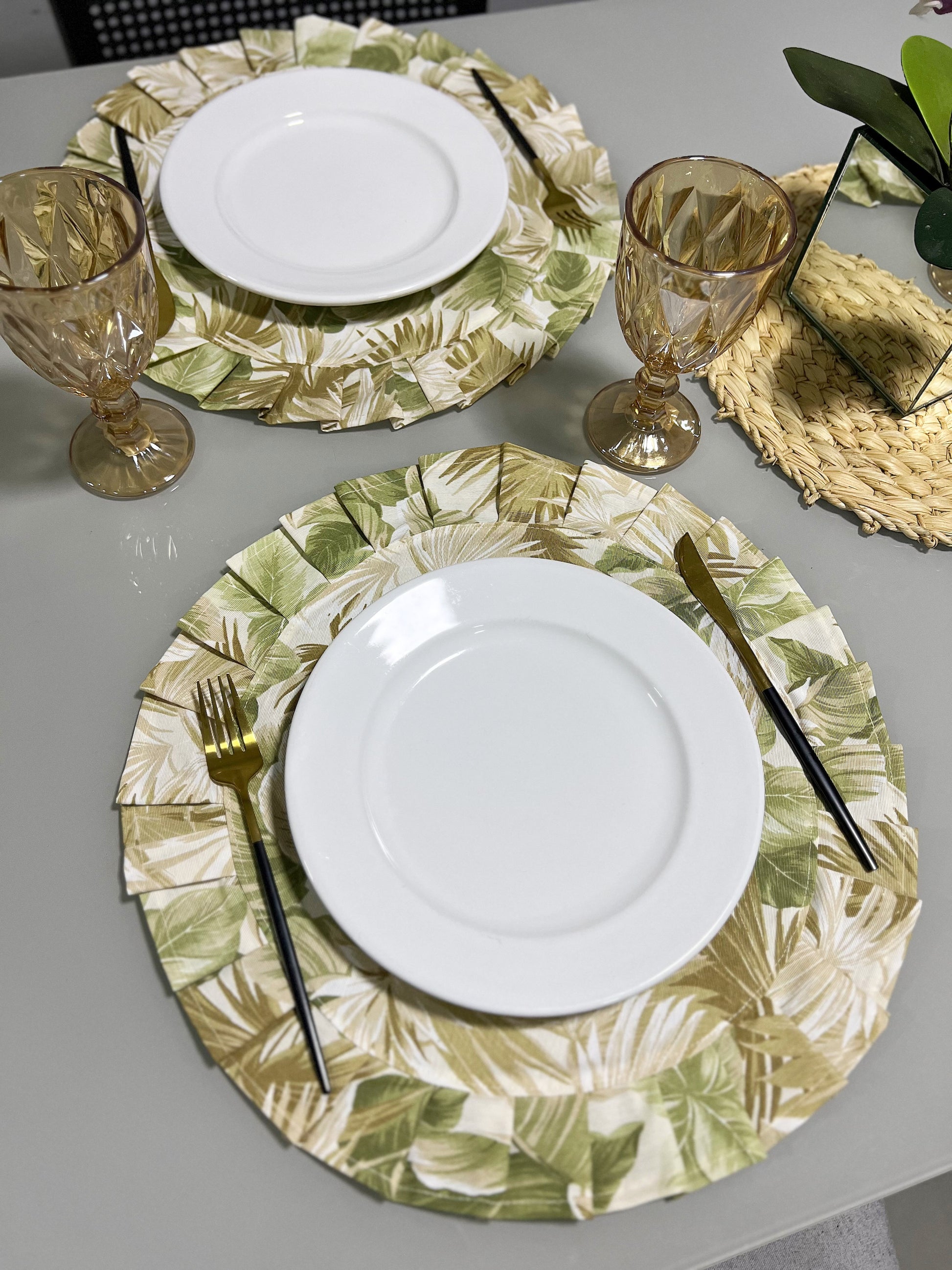 Sousplat Lugar Americano Redondo Com Babados Folhas Verde Claro